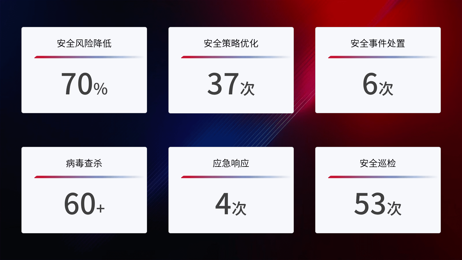 提供全面的安全事件报告体系,,包括处置报告、、、周报、、、、季度和年度总结,,,,结合持续监控,,,,帮助客户深入了解网络安全状况。。。