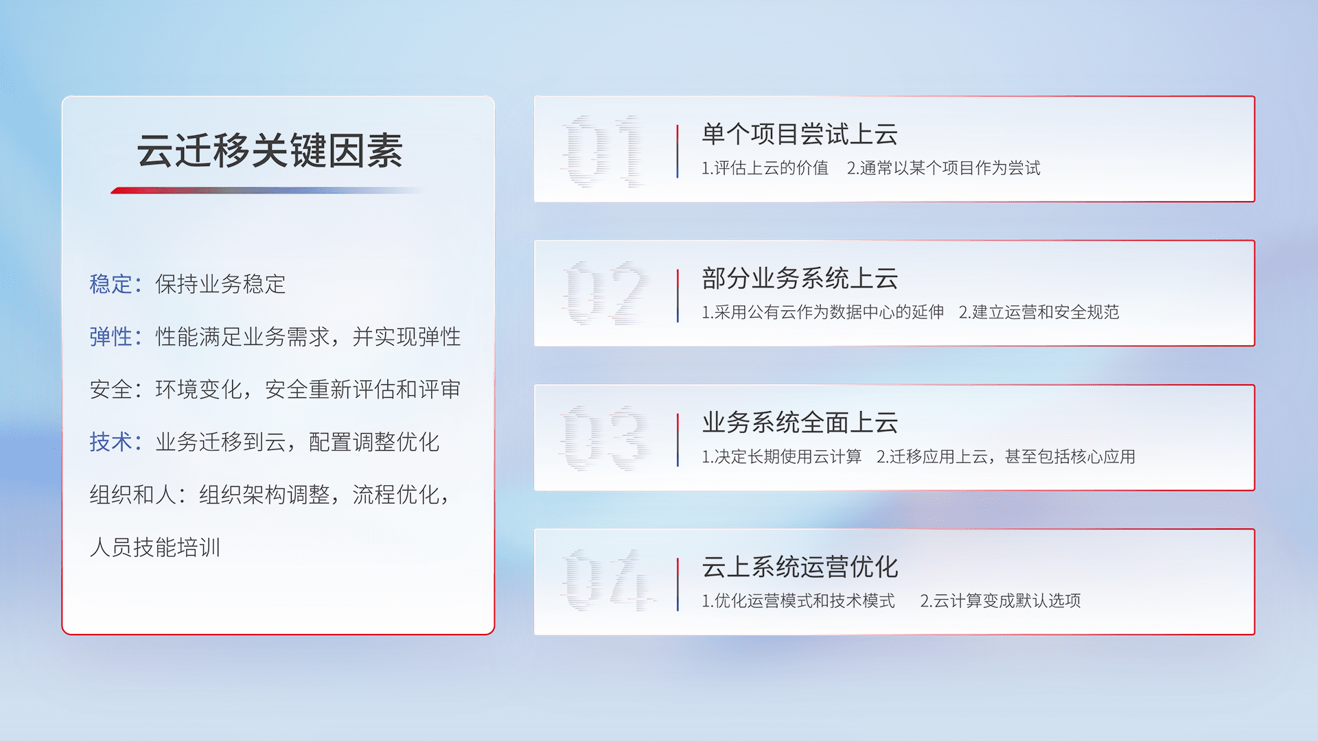 结合实际业务,,,,从规划设计、、云平台选型、、、、云原生改造、、、、数据迁移、、集成交付,,,,迁移全过程为客户识别最佳上云路径,,,,做好风险识别管理,,,设计网络架构、、、、身份权限、、、、安全审计合规、、、操作审计、、日志审计、、、、监控告警策略、、多站点容灾设计等,,,对云上基础设施进行整体规划,,提升IT治理水平,,,以满足弹性、、高可用、、高性能的需求。。。