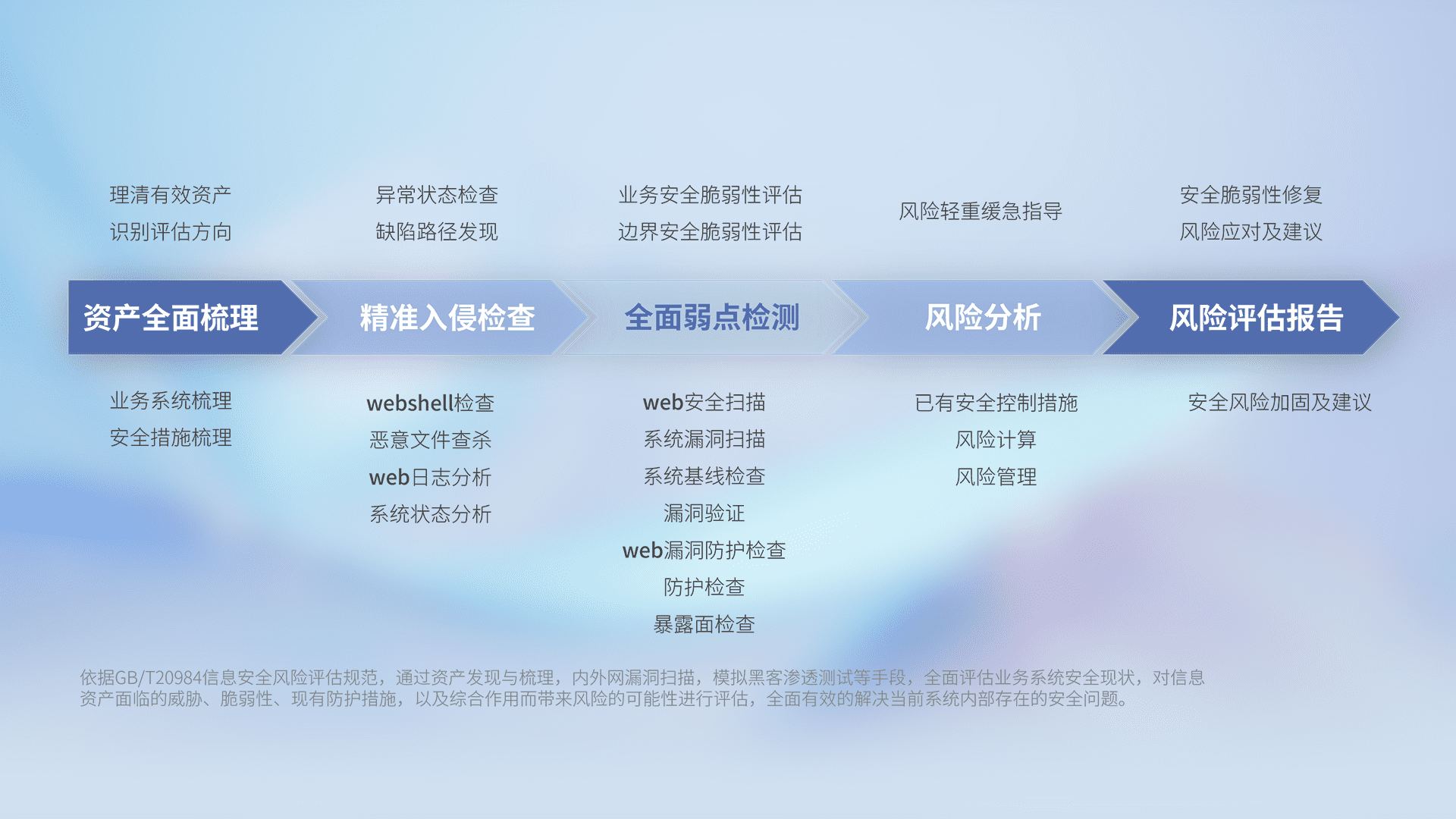 针对客户行业特性,,,,以专业的安全服务+多厂商联合解决方案提供专属的一站式安全管理服务,,帮助客户全面感知网络空间威胁,,基于识别、、、、检测、、、分析、、防护、、、监测、、、、响应的服务理论模型,,,,从方案咨询、、集成交付、、、、评估验证、、、、优化加固、、、、运维运营,,致力于为客户提供完整的闭环管理式安全服务。。以实战经验为客户打造高抵御风险的安全体系,,,帮助客户发现威胁、、、对抗威胁、、、、处置威胁,,,,不断积累安全对抗能力,,,,持续保障数字化安全。。。